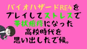 しかし、勉強についていけなくても、なぜか開き直ることもできず、「勉強ができないやつがゲームをやってはいけない」というよく分からない制限をかけていたため、高校に入学したらプレイしようと思っていたバイオハザード4を未プレイだったことを、バイオハザードRE4をプレイしていて思い出したで候。